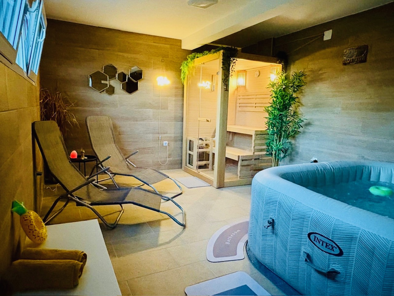 Inside the lower level of the house, there’s a small wellness zone with a jacuzzi, sauna, and shower – perfect for any weather.